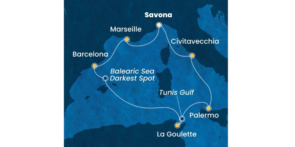 Trasa: Savona – Marsylia – Barcelona – La Goulette – Palermo – Civitavecchia – Savona to idealne połączenie kultury, historii i relaksu. Od urokliwych włoskich miasteczek, przez barwną Francję i tętniącą życiem Hiszpanię, po egzotyczną Tunezję – każdy port to nowa przygoda i niezapomniane widoki. Zanurz się w śródziemnomorskim słońcu, smakuj lokalne specjały i odkrywaj fascynujące zabytki.