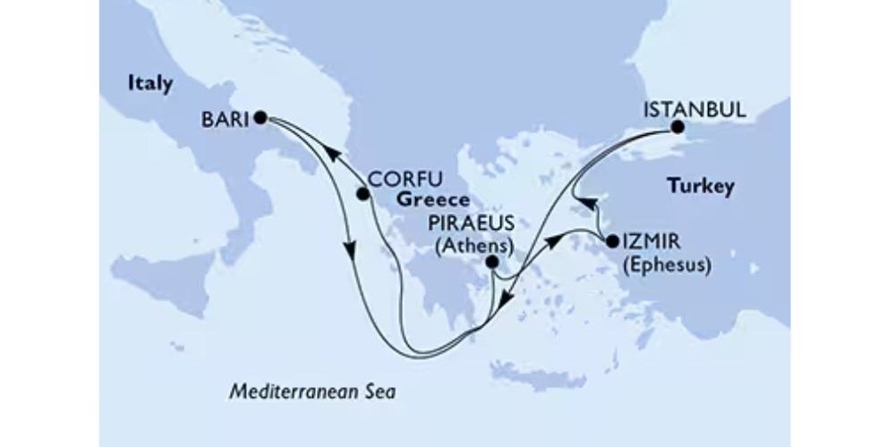 Rejs wycieczkowcem przez Bari, Pireus, Izmir, Istambuł i Korfu to wyjątkowa okazja do odkrywania bogactwa kulturowego, historycznego i naturalnego tych fascynujących miejsc.