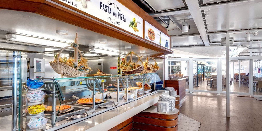 - pełne wyżywienie na pokładzie: śniadanie, obiad, kolacja, napoje podstawowe do posiłków bufetowych - śniadanie: kawa, herbata, woda, soki z dystrybutorów (na szklanki); obiad / kolacja: woda z dystrybutora (na szklanki)