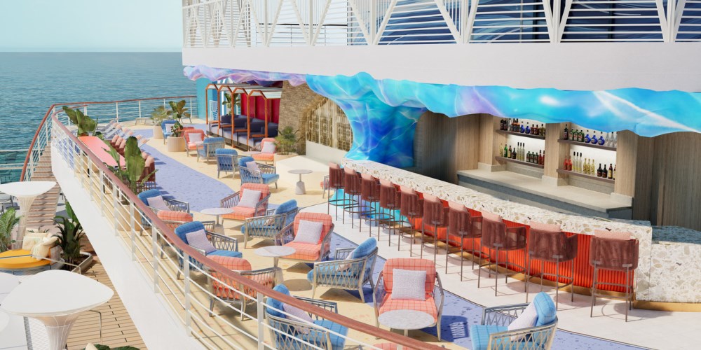 Rozszerzony deck basenowy – więcej miejsc do opalania, baru i atrakcji wodnych.